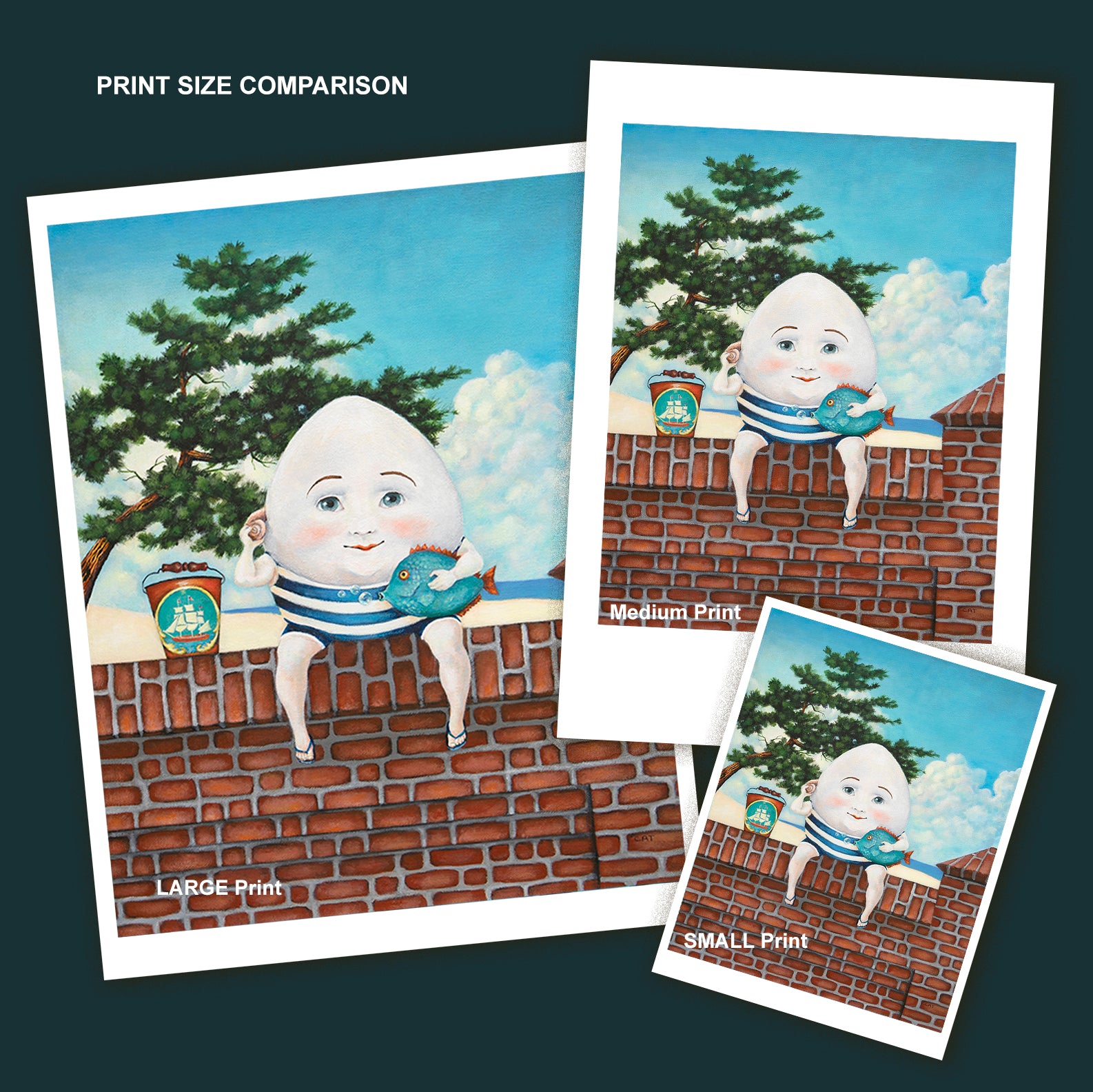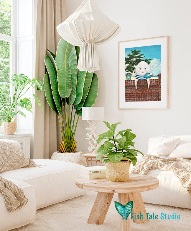 Humpty Dumpty needed a break, no pun intended, so he headed to the beach. Here Humpty sits on a brick wall that belongs to a lavish beachfront mansion. He listens to the sound of the ocean through his seashell, although surely he could hear the ocean without it. Humpty wears a retro striped bathing suit and a pair of tiny blue flip flops. This charming rendition of Humpty Dumpty would look beautiful in a coastal nursery. Or, being an egg and all, in the kitchen.